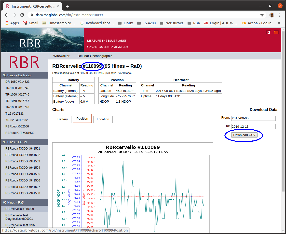Call the script using your customer URL slug, serial number, start date, and end date as arguments. For example, to download all data for the RBR's device "110099" from September 1, 2017 to December 31, 2020, use the script with this command: