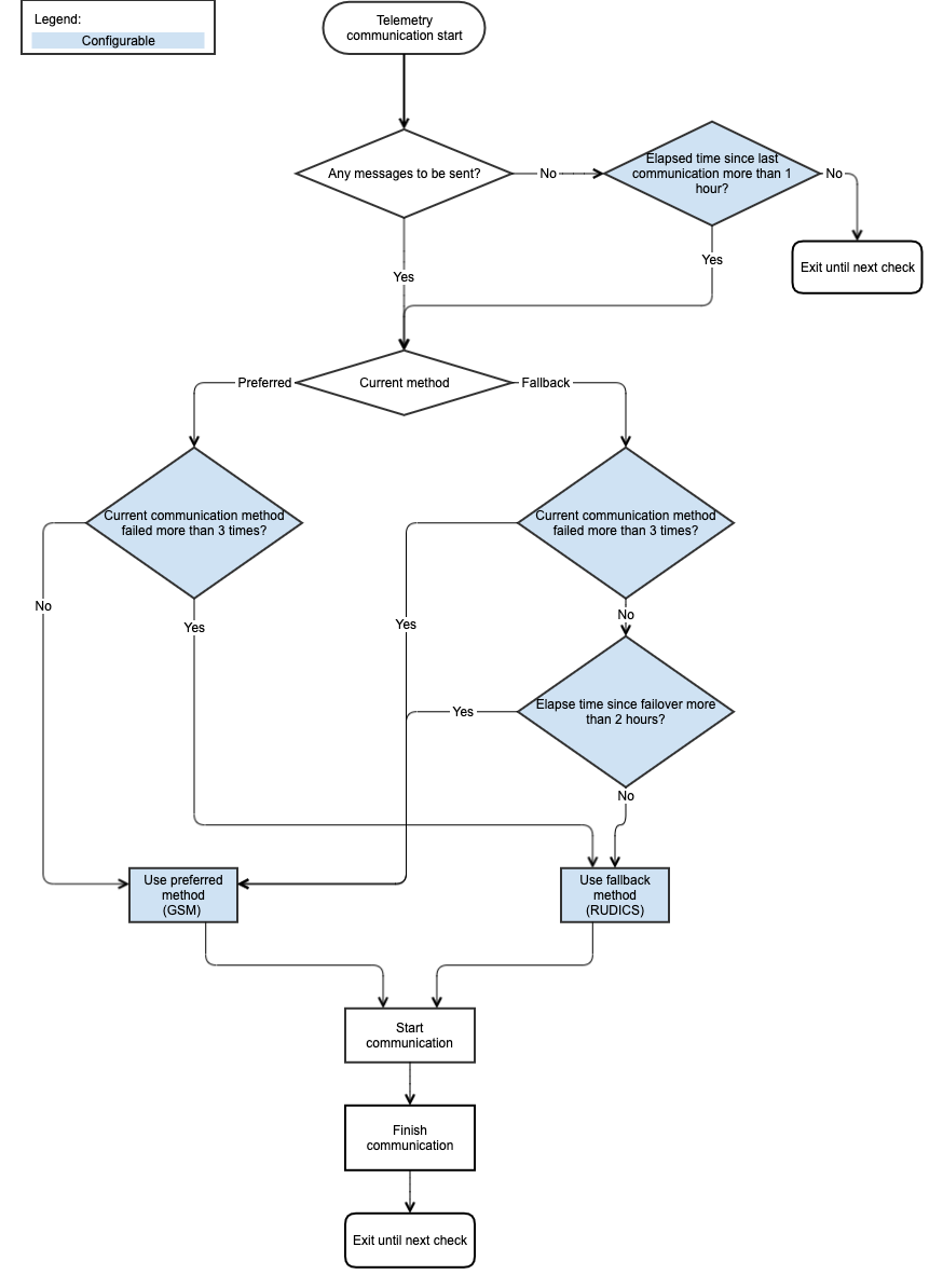 RBRcervellos equipped with a dual-mode modem have a failover mechanism which determines its communication method. Usually the preferred method would be GSM, due to lower cost and faster speeds, and the fallback method would be Iridium RUDICS.