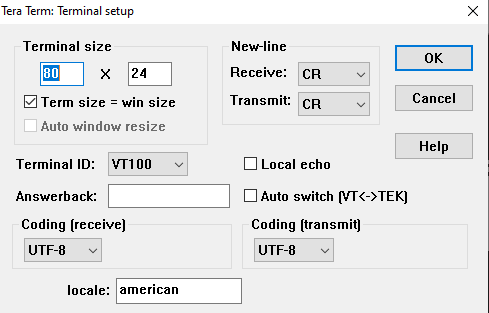 Tera Term is an open-source terminal emulator that lets you connect to hosts via serial port or the network. The default settings should work with the RBRcervello interface. In the unlikely event when they do not, load the configuration file provided below using the Setup > Restore setup menu.