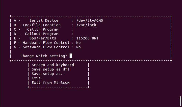 Minicom is a serial communication program that connects to devices through a GNU/Linux serial ports. Use the -s command to set up the terminal with the right port and settings, or execute it with explicit settings at runtime with the correct device: