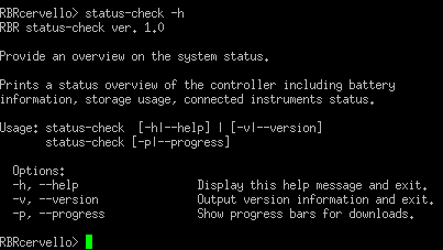 This menu can be accessed via the diagnostic port using an RS232 interface (115200 8N1). This menu is a fully-featured Bash terminal (Restricted Bash) with 'tab' completion. The available commands are shown by executing the 'help' command. You will find all you need to set up a deployment using the RBRcervata and RBR loggers. As a quick in menu reference, each command prints a short manual by executing them with the '-h' or '--help' argument to it.