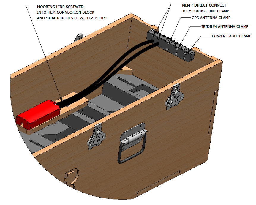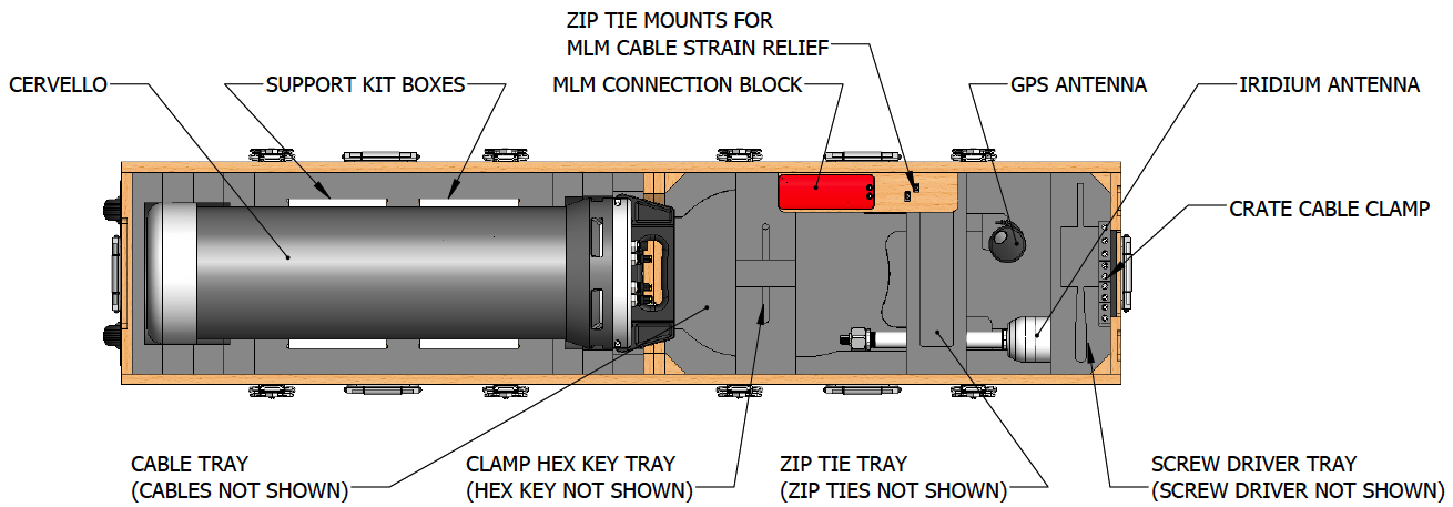 The RBRcervello Antarctica crate contains all the elements needed to deploy the RBRcervello controller in dry environments with a mooring line feed. It features cable feed-throughs for a mooring line, an external GPS antenna, and an external Iridium antenna, as well as staples, screws, screwdriver, hex keys, zip ties, castors, and clamps.