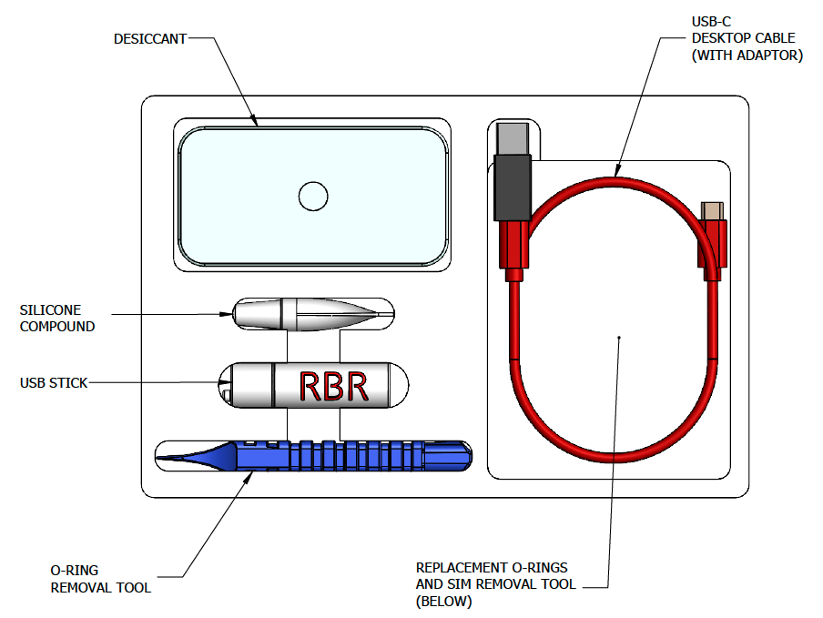The RBRcervello support kit contains an assortment of basic accessories and spare parts, as presented below. If you need more units, contact RBR.