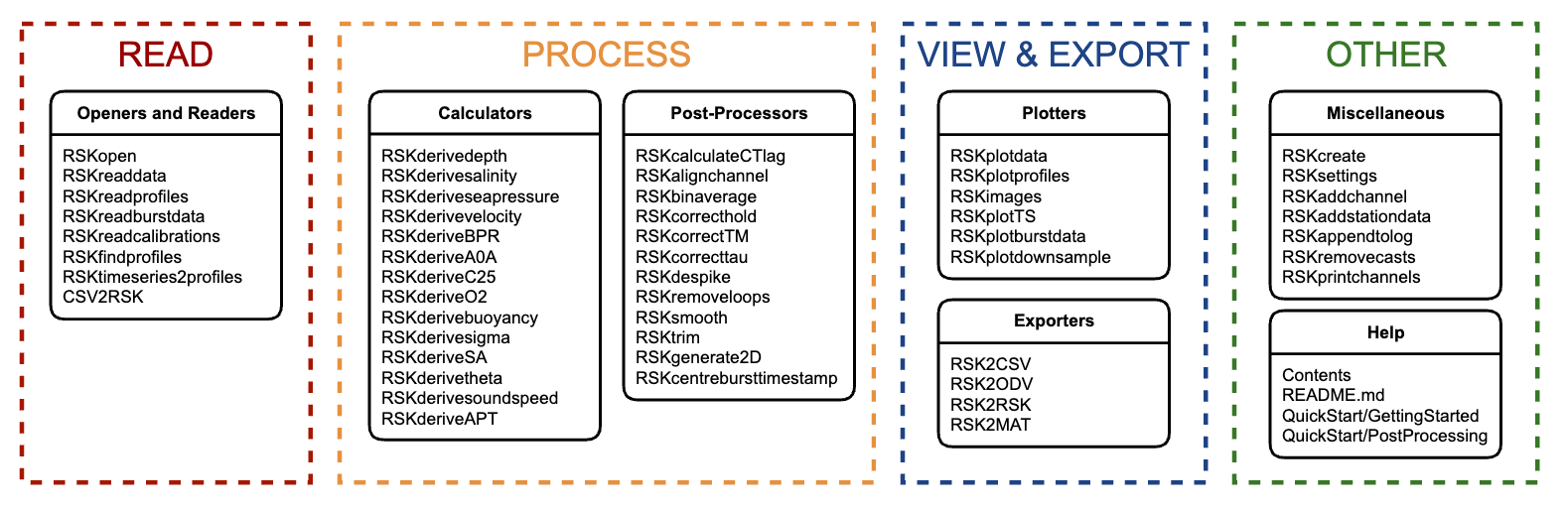 RSKtools v3.6.0 contains 51 user-facing functions which are grouped under the categories: read, process, view & export, and other.