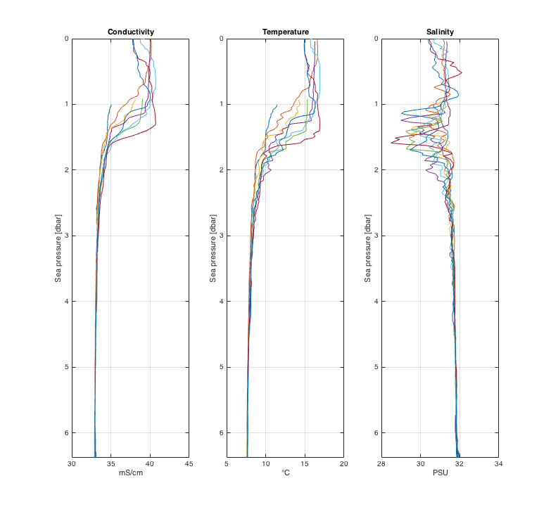 The figure above is the profiles plotted using RSKplotprofiles. Selecting conductivity, temperature and salinity channels facilitates comparison. |