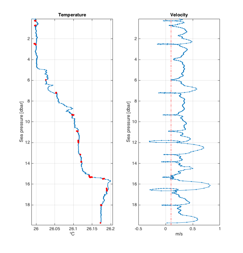 Shown here are profiles of temperature (left panel) and profiling velocity (right panel). The red dash-dot line illustrates the threshold velocity; set in this example to 0.1 m/s. The temperature readings for which the profiling velocity was below 0.1 m/s are illustrated by the red dots. |