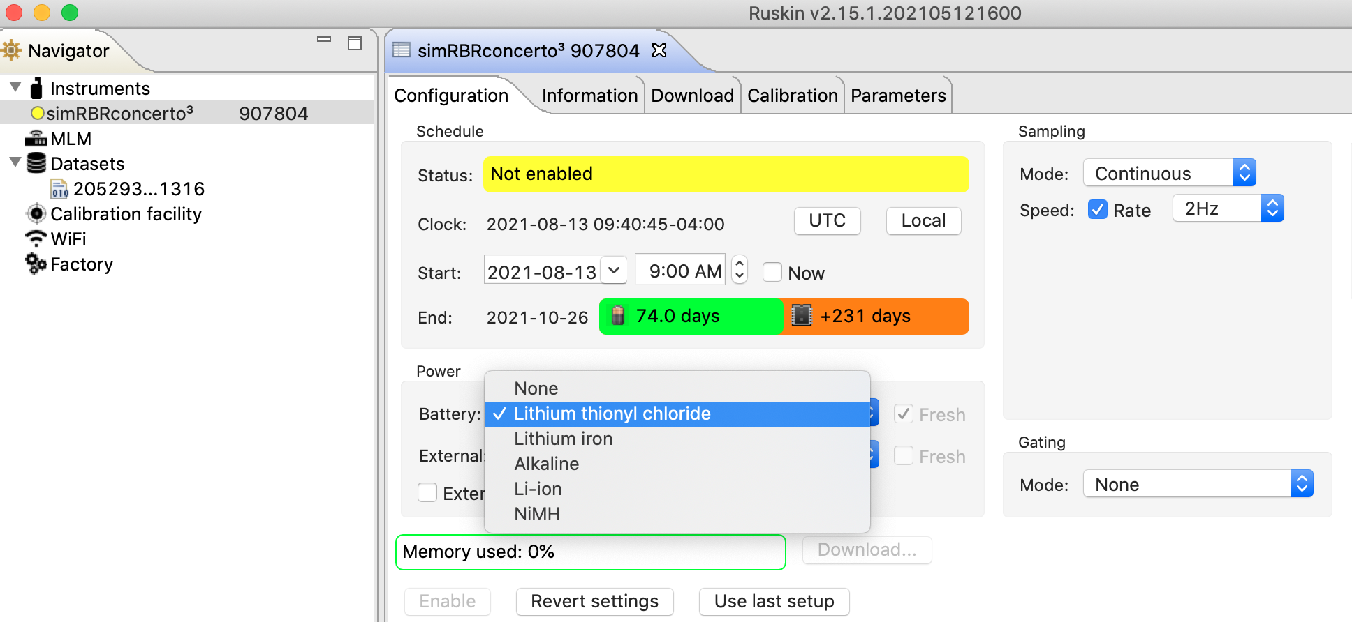 Deployment times of a Generation3 instrument can be determined using Ruskin autonomy engine and are affected by the battery type selected, as well as by sampling power and instrument memory.