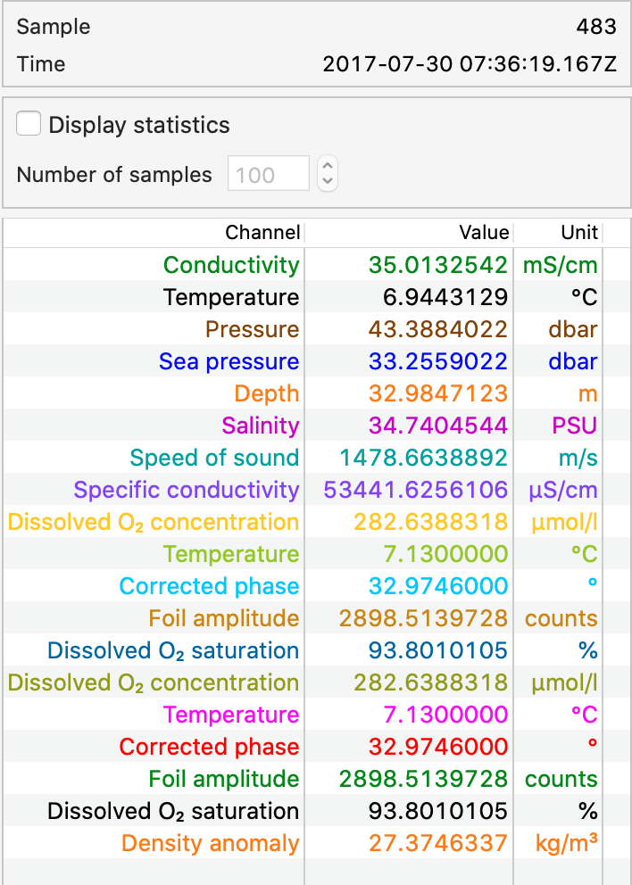 Density anomaly which is simply the deviation of measured seawater density from the standard (density of water) is displayed in Ruskin, provided the logger has a conductivity channel. Ruskin uses the UNESCO (EOS-80) equation to calculate the density anomaly. To get the actual measured seawater density, the density anomaly equation can be rearranged: