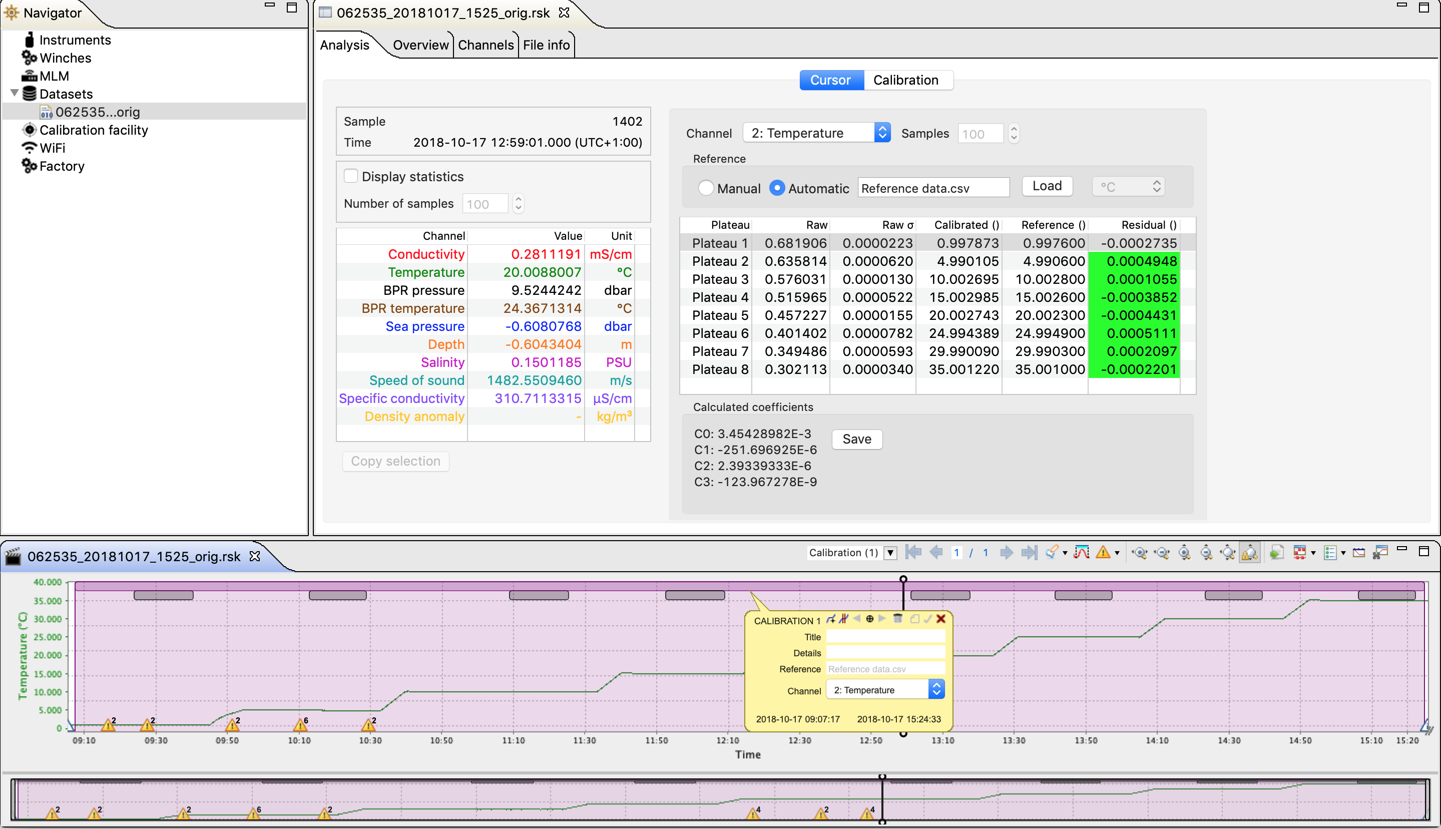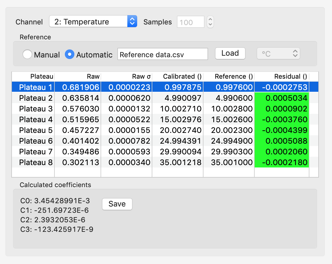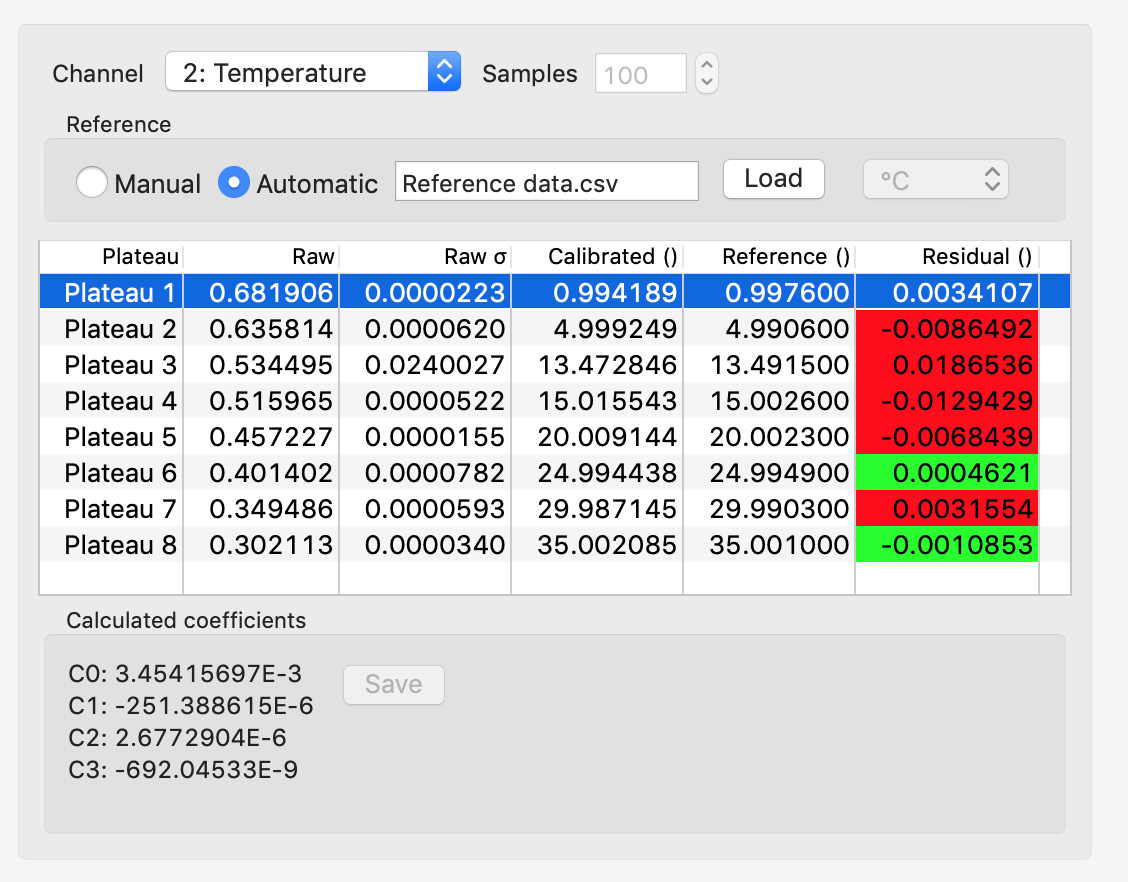 The Save button will be enabled, and the calibration completed once all of the plateau residuals are valid, indicated by being highlighted in green colour. Saving the calibration performs three operations; stores the newly generated coefficients into the RSK file and recalculates the data, stores the new coefficients into a connected instrument with the same serial number, and creates a certificate for the calibration and stores it on the instrument record at RBR.
