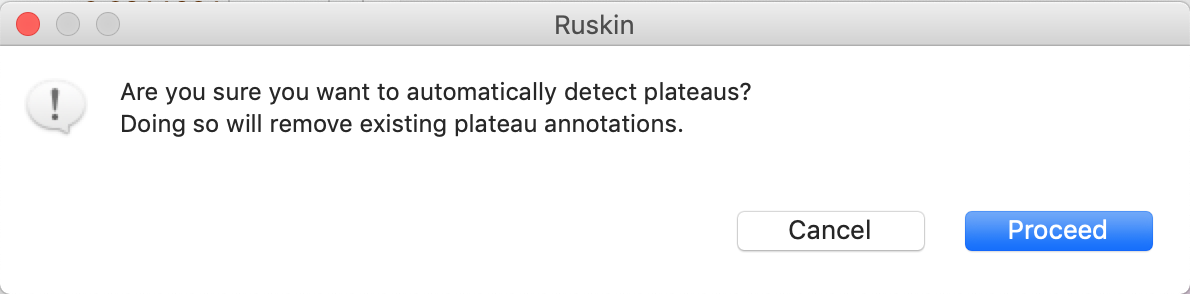 If there are existing plateaus, a warning dialogue will pop up, indicating that all existing plateau markers will be removed. Click 'Proceed' to continue.