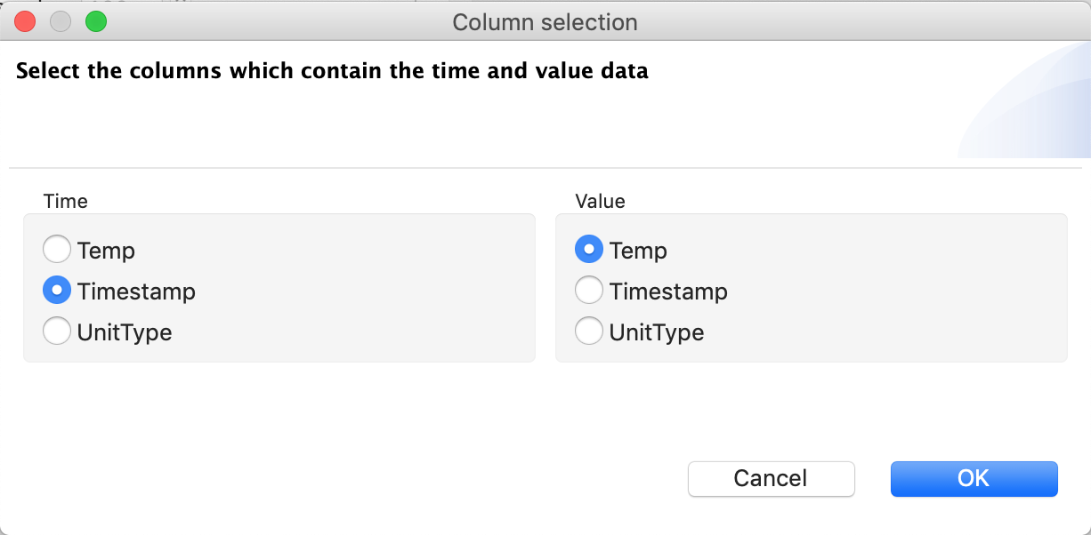 Select the appropriate columns for time and data from the Column selection dialog and click OK.