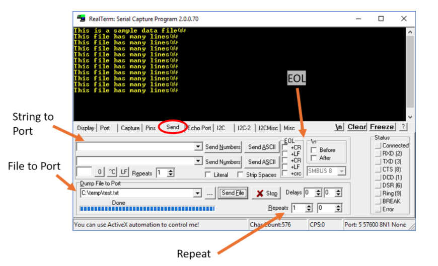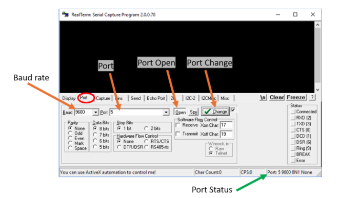 In the example here, it is Port 5. The baud rate selected in Real erm should match the one selected in Ruskin.