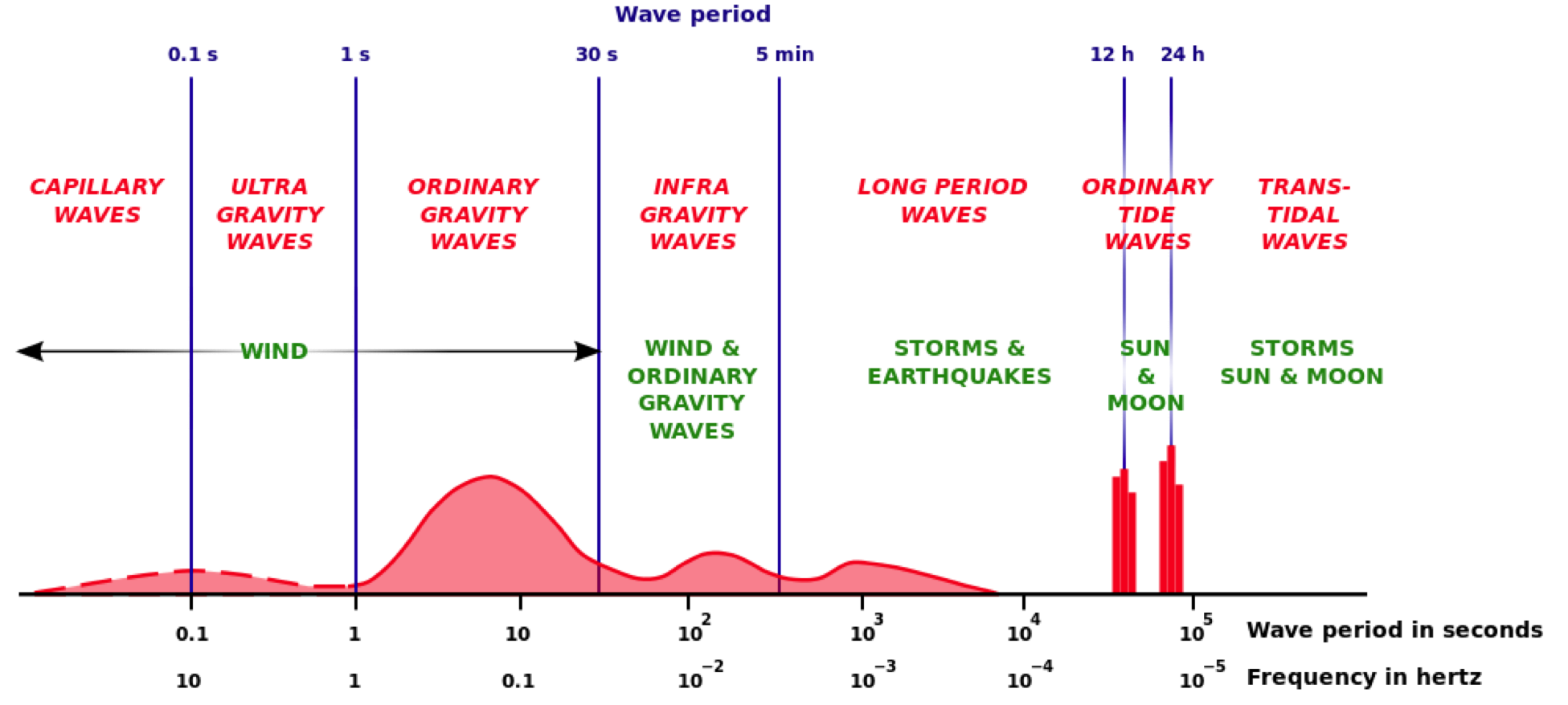 Tides are represented as long-term changes in the depth of the logger whereas waves are represented as high-frequency changes. The spectrum of ocean surface waves varies substantially in energy as well as in frequency. Below shows this spectrum of tidal frequency and energy. Scientists and engineers are interested in monitoring the local effect of waves as they contribute to the transport of sediments and erosion patterns. Tide periods are influenced by both the sun and the moon and are at 12 & 24hrs, whereas waves, which are typically <30 seconds, are primarily driven by wind. The total energy found across the wave spectrum is primarily divided into these two groups of low-frequency waves (tides) and high-frequency gravity waves.